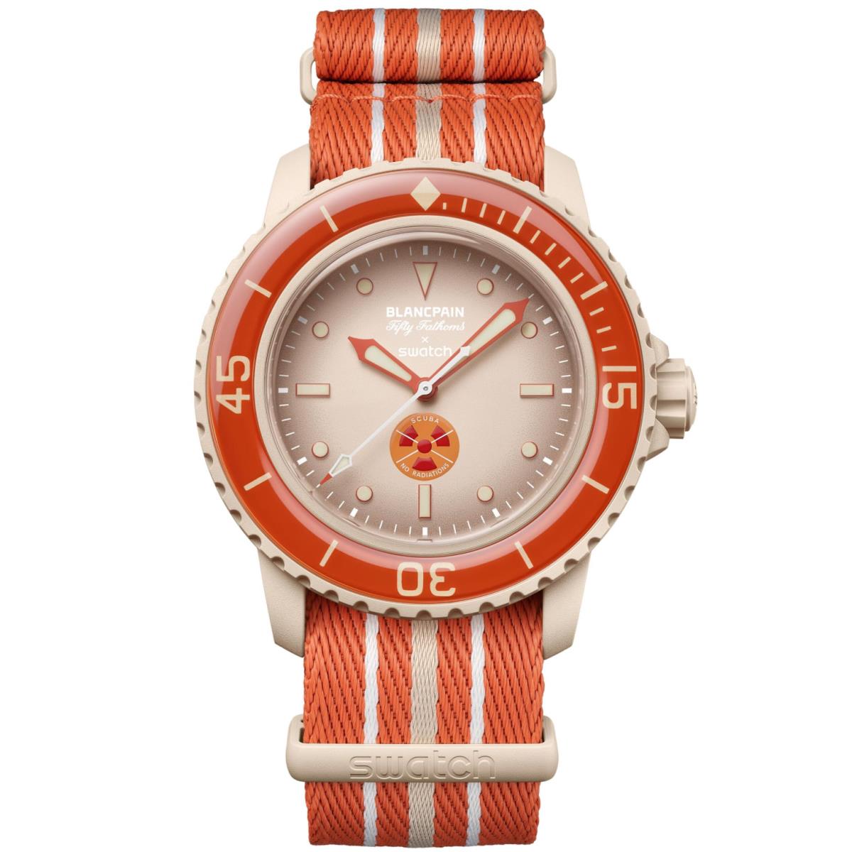 This Blancpain X Swatch watch honors Blancpain’s Fifty Fathoms, the first true diver’s watch. Its black case and crown are made of Bioceramic material. The word “Swatch” is inscribed on the outer left side of the case. The dial has a black sunbrushed finish and features a date indicator between 4 and 5 o’clock. The hour indexes, hour, and minute hands, as well as the scale on the bezel, are enriched with Grade A Super-LumiNova® for outstanding legibility in the dark. The one-direction rotating black Bioceramic bezel, and biosourced glass are treated with an anti-scratch coating. The SISTEM51 mechanical movement is visible thanks to a transparent sapphire glass and features an illustration of the Oceanus Procellarum (Ocean of Storms) region of the moon and the Okenia Luna nudibranch in digital print. Five inspirational inscriptions can be found on the back of the watch: PASSION FOR DIVING – LICENCE TO EXPLORE – OCEAN BREATH – PROTECT WHAT YOU LOVE and IMMERSE YOURSELF. The NATO strap is made of recycled fishing nets. The pin buckle and loops are made of Bioceramic material.